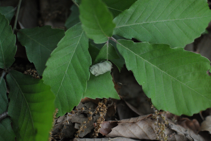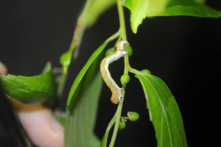 エノキの葉にしっかりした食痕があったので、ゴマダラチョウかと思ったのですが、探してみたらシャクトリムシでした。