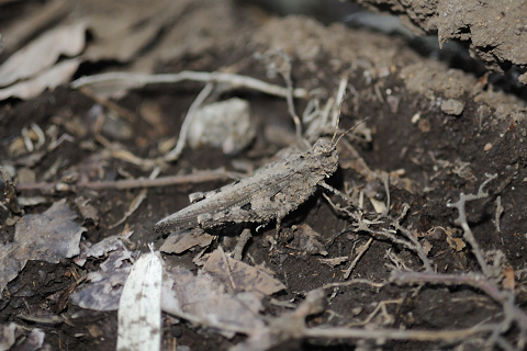 このイボバッタはあまり草の生えない場所でも見られる種のため発見。