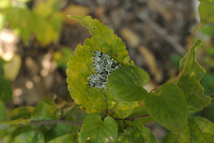 このケンモンミドリキリガ以外にも、青緑系の翅を持ち、コケのある樹皮に近い模様を持つ蛾が何種類かいます。