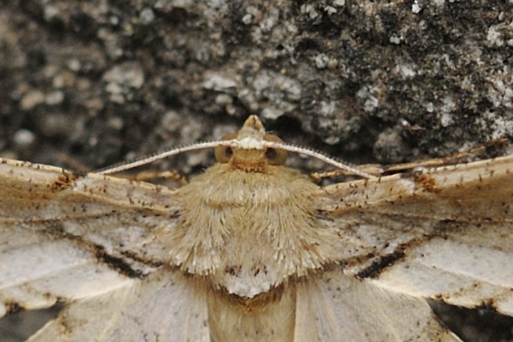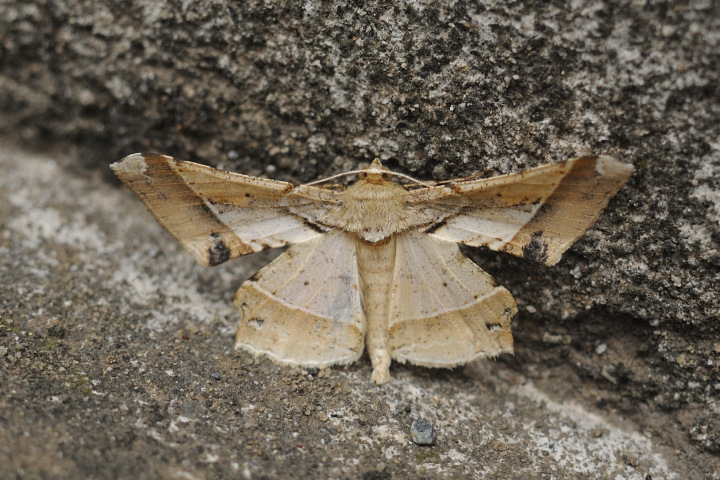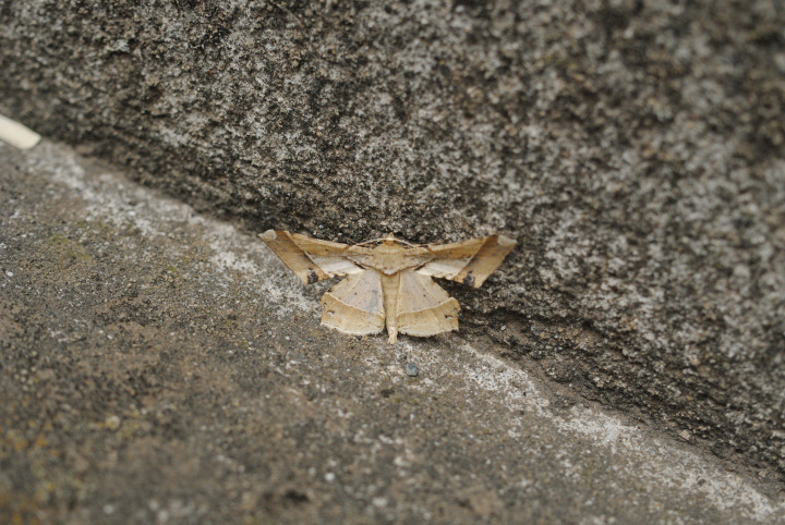 ツマジロエダシャク 独特な翅の形、そして止まり方をしている蛾に遭遇! 調べてみると、ツマジロエダシャク。 シャープな形状の前翅が美しい! 前翅と後翅の隙間を空けて開いた状態で止まっているのも独特ですね。 発生は春と秋の2回。 幼虫はクスノキの葉を食べるとのこと。 クスノキの葉に食痕を見つけた場合、ほとんどがアオスジアゲハのものだと思っていたのですが、このツマジロエダシャクが食べたものもあったのかも。 顔を拡大してみると、目玉のような偽瞳孔がハッキリ! 蛾というより蝶の顔みたいですね。