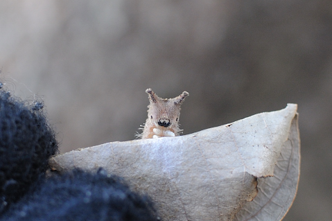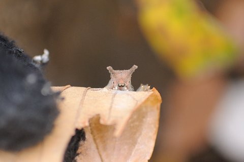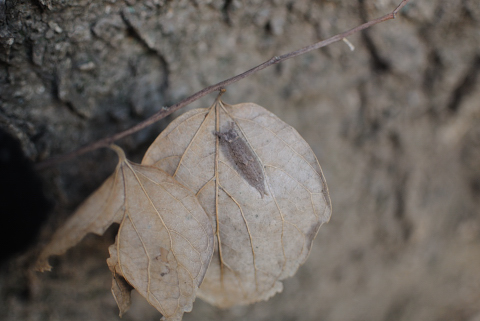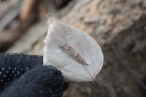 ゴマダラチョウの幼虫はエノキの葉を食べて成長していきますが、冬になると木の根元へ降りてきて、落ち葉の裏にくっついて越冬します。